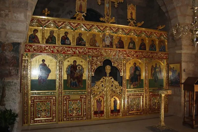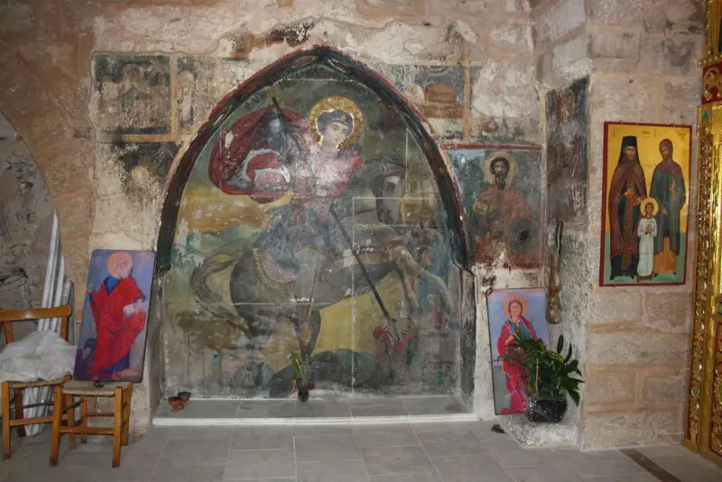According to tradition, the name "Teratsiotis" associated with Agios Georgios is linked to a miracle. During the saint's feast day, among the faithful, there was a young wealthy girl wearing a golden necklace. At some point, the necklace fell from her neck, and despite continuous searching by herself and her family, they were unable to locate it. The girl then sought help from Agios Georgios to find it. One night, the saint appeared to her and instructed her to return to the church to pray. He pointed out the exact spot where the jewel was found: embedded in the trunk of one of the many carob trees (known as "teratsies" in Greek) in the vicinity of the church. Since then, this particular church of Agios Georgios became known as "Teratsiotis."