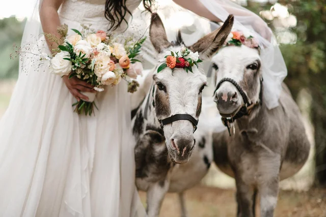 Donkeys: Our donkeys can be included in your wedding celebration, adding a touch of charm and whimsy to the occasion. You can incorporate them into your photoshoot or even have them play a role in the ceremony, such as carrying the bride or groom to the church or for a unique entrance or exit.